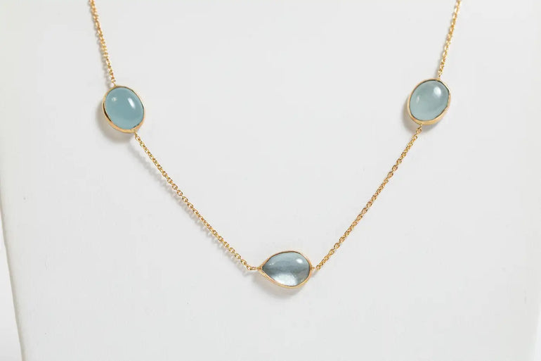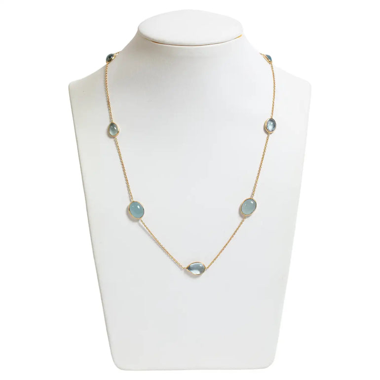 Collier chaîne forçat ronde en or jaune 18 carats et sept aigues marines cabochons en serties clos.