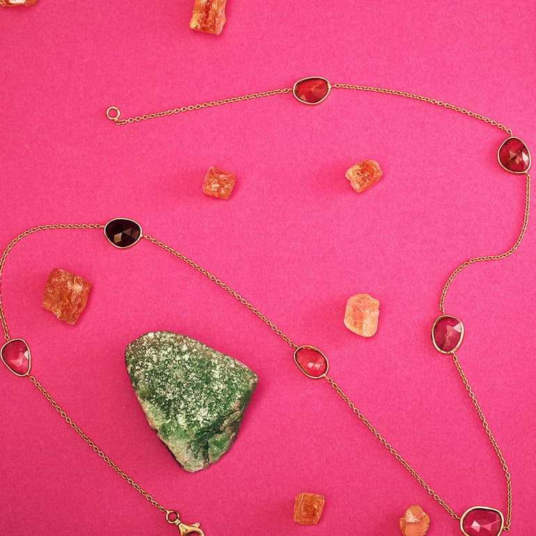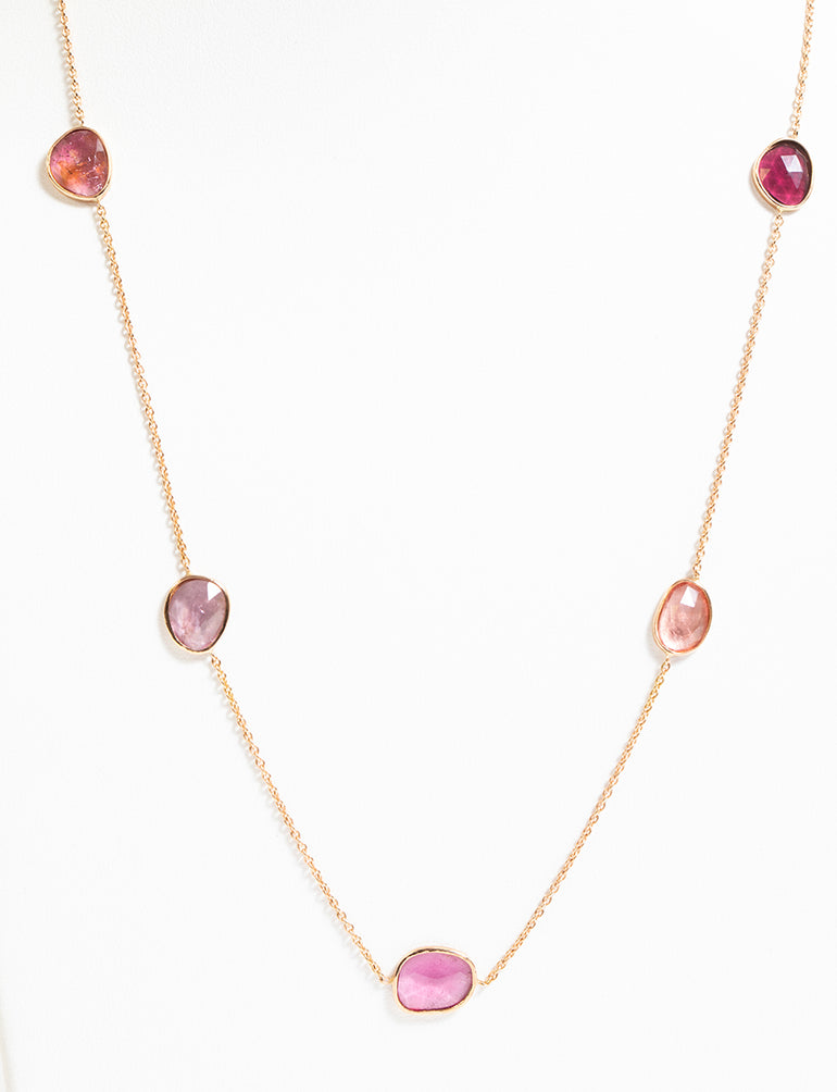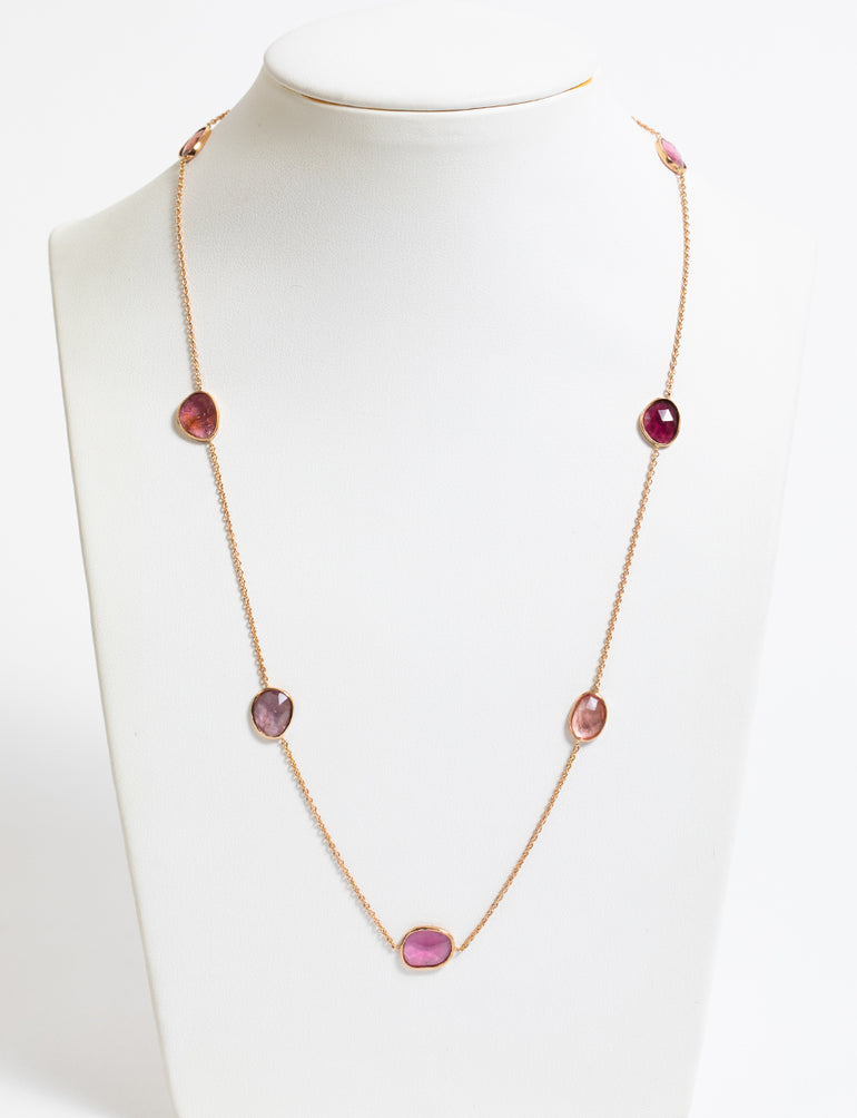 Collier chaîne forçat ronde en or rose 18 carats et sept tourmalines roses taille rose en sertie clos.