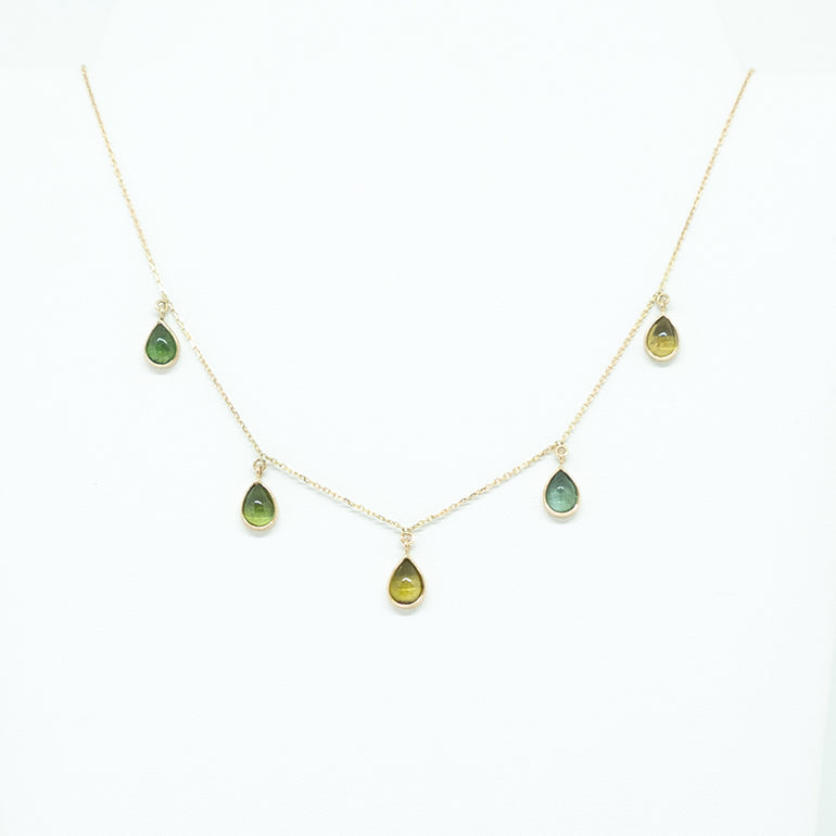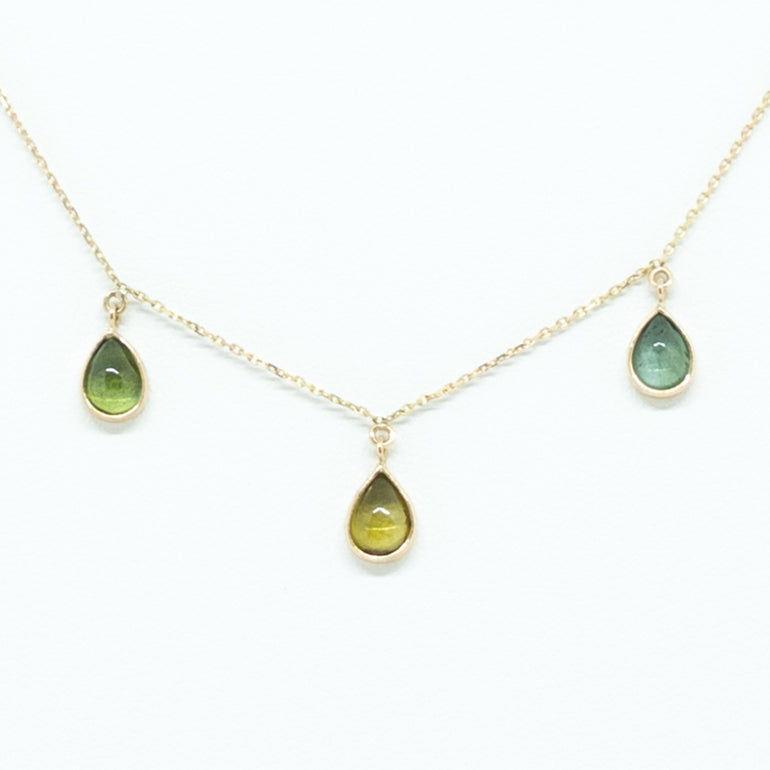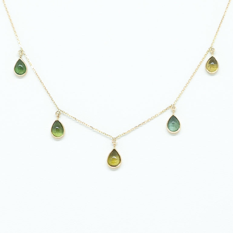 Collier chaîne forçat diamantée en or jaune 18 carats et tourmalines vertes cabochons poires en sertie clos.