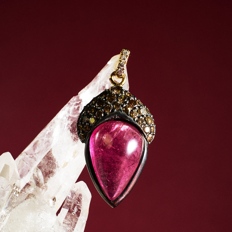 Sublime pendentif en argent noirci (925 millièmes), serti d'une tourmaline poire cabochon rose de 12,03 carats en sertie clos, motif pavage de diamants bruns.