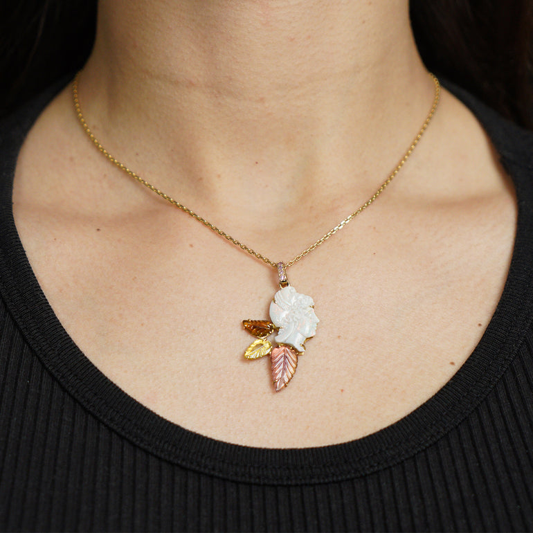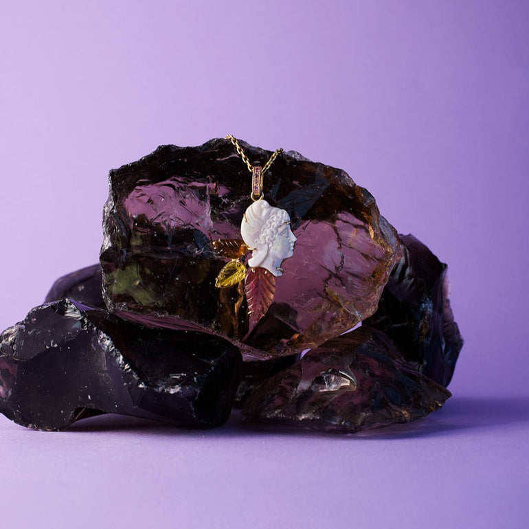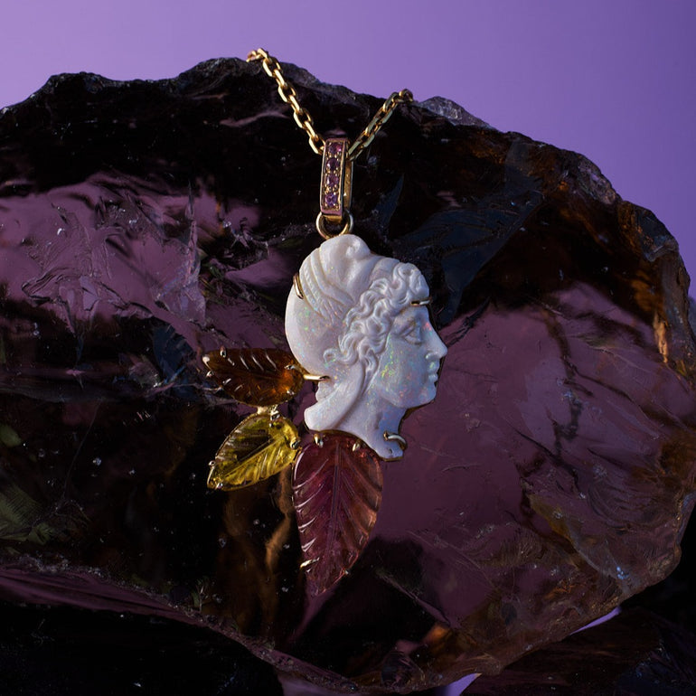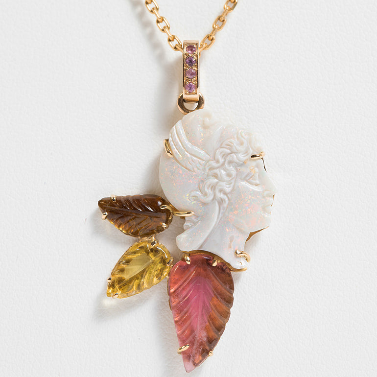 L'opale gravée en forme de tête est entourée de trois feuilles gravées, des tourmalines. La bélière est sertie de saphirs roses.